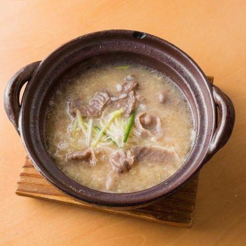 「『やま金』の〆はやっぱり土鍋ご飯とソルロンタンだよね」そう仰っていただけるほど人気の「ソルロンタン」。牛の骨やお肉を10時間以上じっくり煮込んだ韓国料理の代表選手。焼肉の脂を洗い流すような優しい味わいの牛骨スープの雑炊です。辛くなくあっさりとしているので〆にぴったり。全コースにご用意しております。